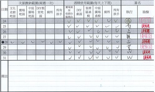 1.每個場次結束,針對使用器具、桌椅、門把使用使品級200ppm的次氯酸鈉拭消毒。