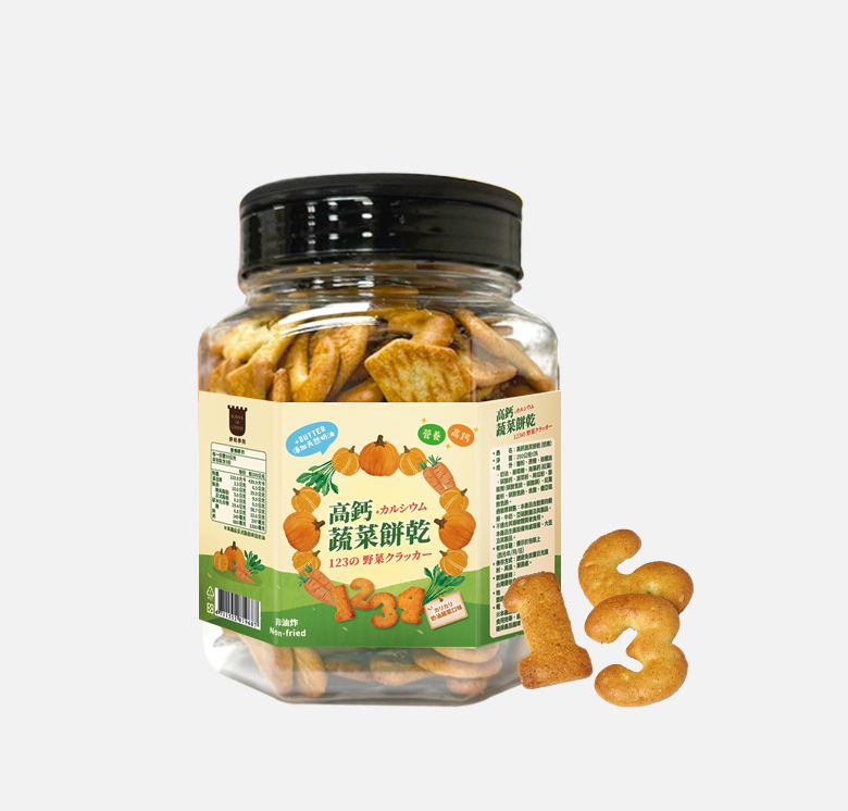 選用在地農產品,擁有豐富的蔬菜纖維,升級版搭配鈣質添加,鹹鹹甜甜搭配數字造型酥鬆餅體,好吃無負擔的美味選擇。