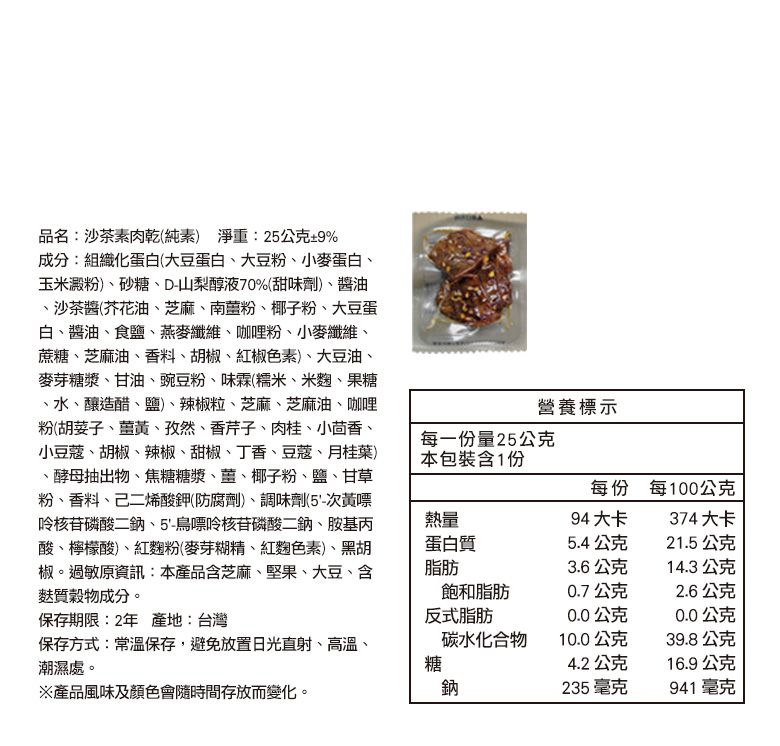 ✅融合經典沙茶醬秘製調味,全素沙茶素肉乾25gx1