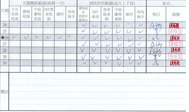 1.每個場次結束,針對使用器具、桌椅、門把使用使品級200ppm的次氯酸鈉拭消毒。