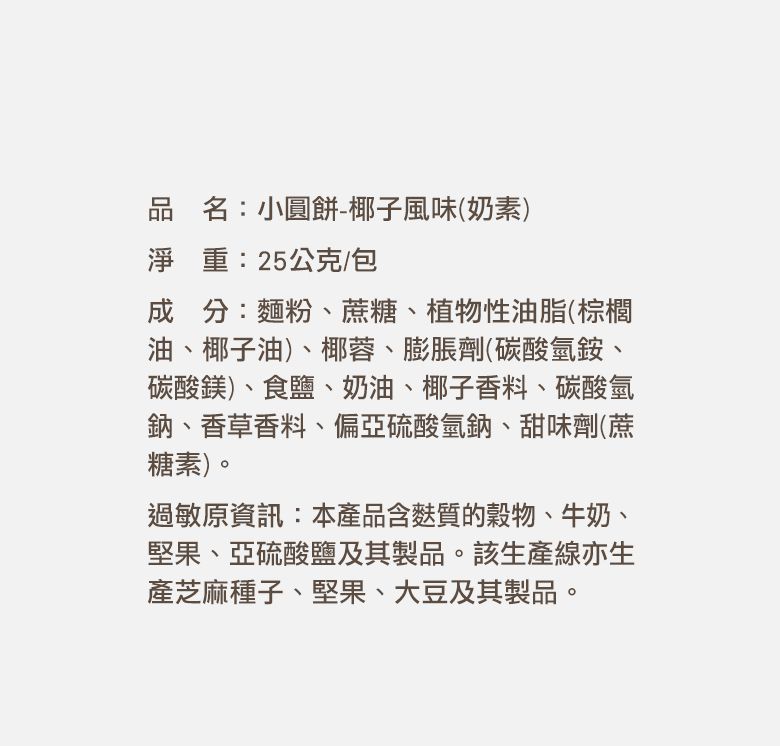 圓形小而巧餅乾,吃的到椰子絲絲絲口感搭配顆顆糖粒,隨著咀嚼,濃郁的椰子香氣佈滿口中,酥酥脆脆超涮嘴。