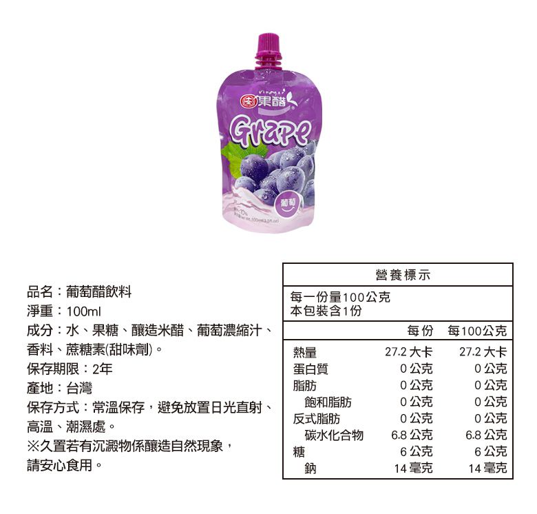 ✅100%國產糯米釀造,不加水、加入果汁調配黃金比例葡萄口味果醋100mlx1