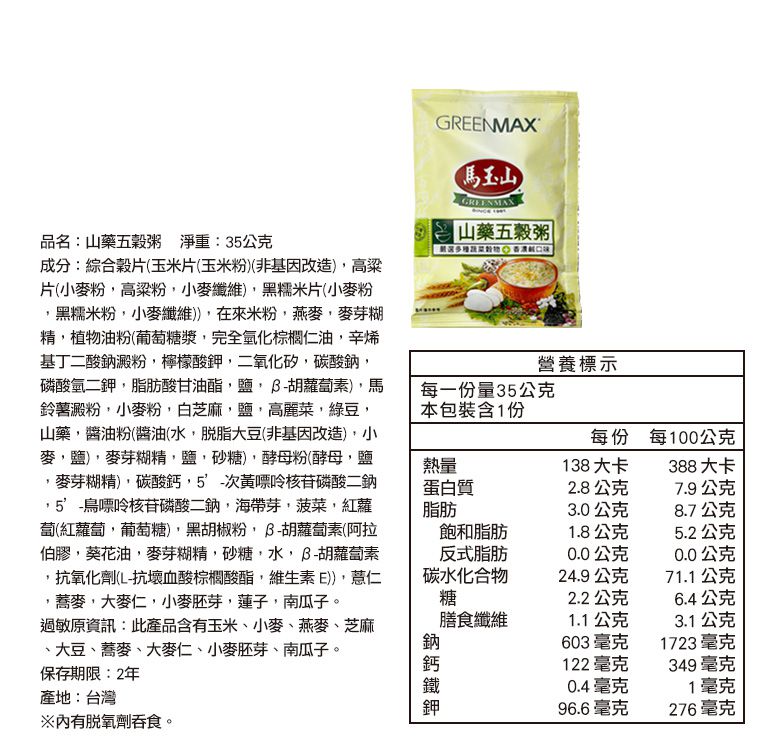 ✅香濃鹹口味、富含膳食纖維、含鈣的山藥五穀粥35gx1
