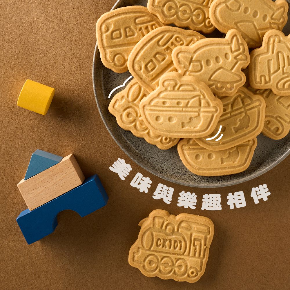 可愛的交通工具搭配香濃雞蛋口味餅乾,酥脆紮實的餅體散發濃郁的蛋香和奶香味,使用天然奶油為餅乾基底,大人小孩可以一同享用,吃得安心、開心。